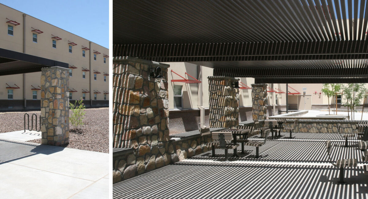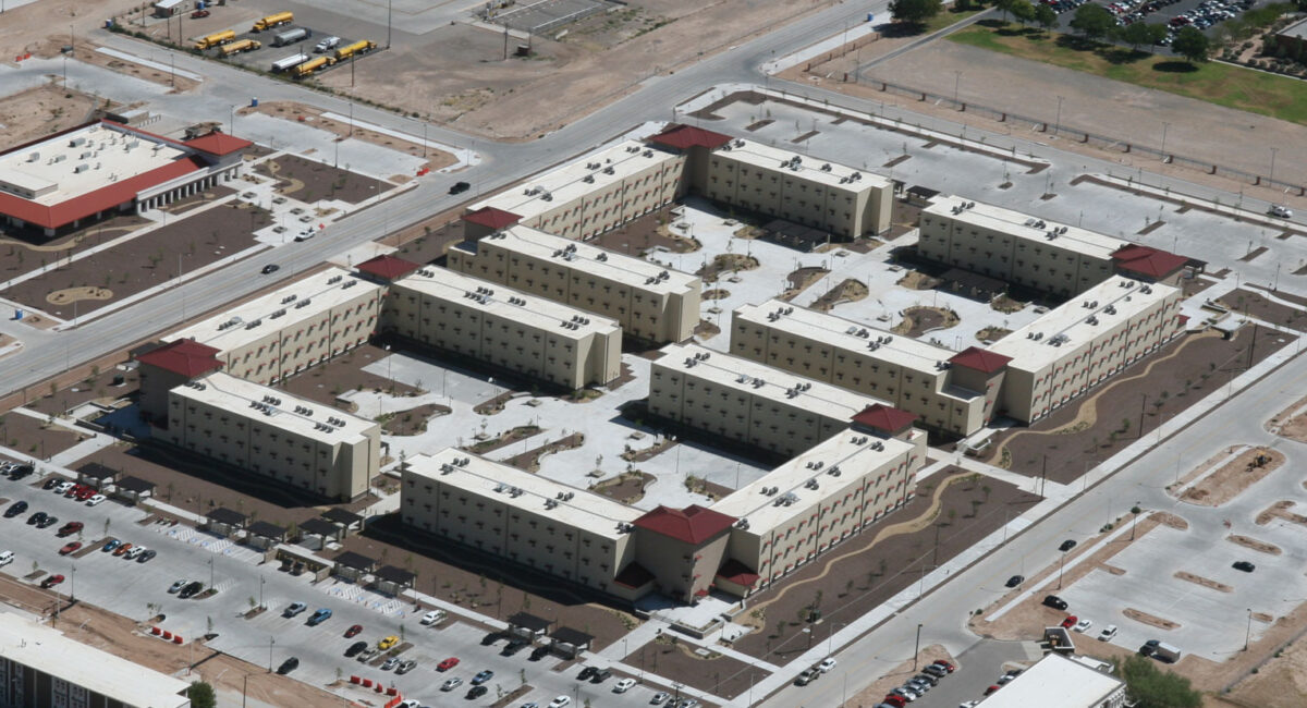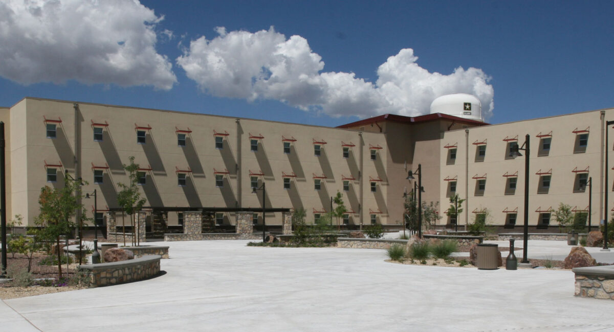 Design/build of four 3-story barracks buildings to house 928 soldiers. Project used modular construction to meet the very aggressive D/B schedule with modular fabricated units delivered to the construction site in a finished state to reduce both the time and manpower required for on-site construction. Completed on-schedule and with zero lost-time accidents after more than 500,000 man hours.